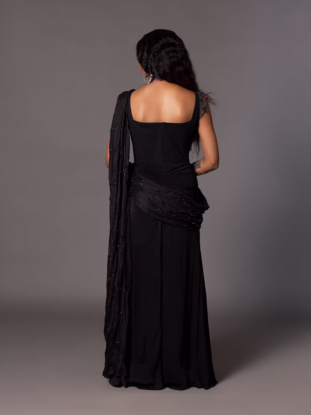 HomeSareeKalbeliya Black Corset Pre-Draped Saree with Belt